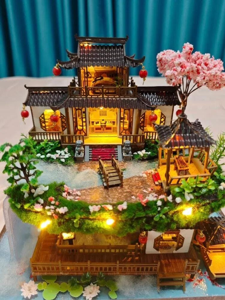 Inspired by classical Jiangnan gardens found in Suzhou and hangZhou, Lotusfall Terrace layers wooden pavilions, cherry-blossom trees, mossed walkways, and a gentle waterfall into one seamless sanctuary. Every detail — carved beams, tiny furnishings, lotus blooms — creates the feeling of wandering through a real riverside retreat.