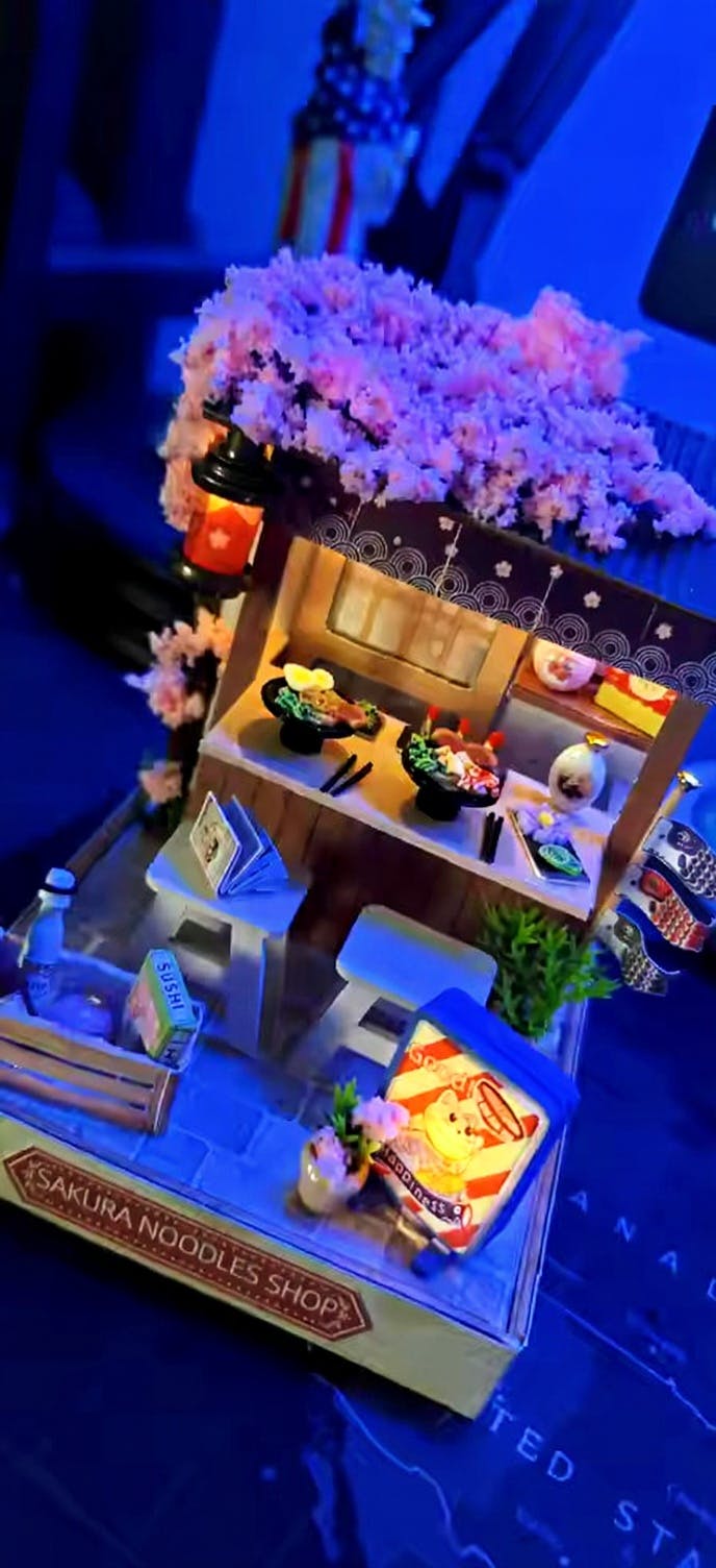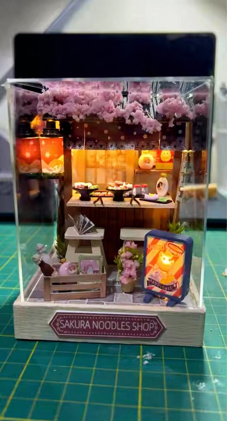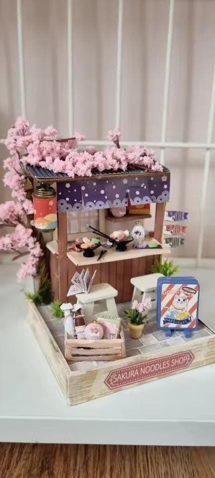 Inspired by Japan’s beloved Yatai street stalls, Sakura Noodle Shop captures the magic of a spring night under the sakura. Each handcrafted element — from the Noren curtains to the tiny bowls of ramen — brings nostalgic charm and warmth to life. A miniature that celebrates comfort, craftsmanship, and the joy of simple, shared meals.